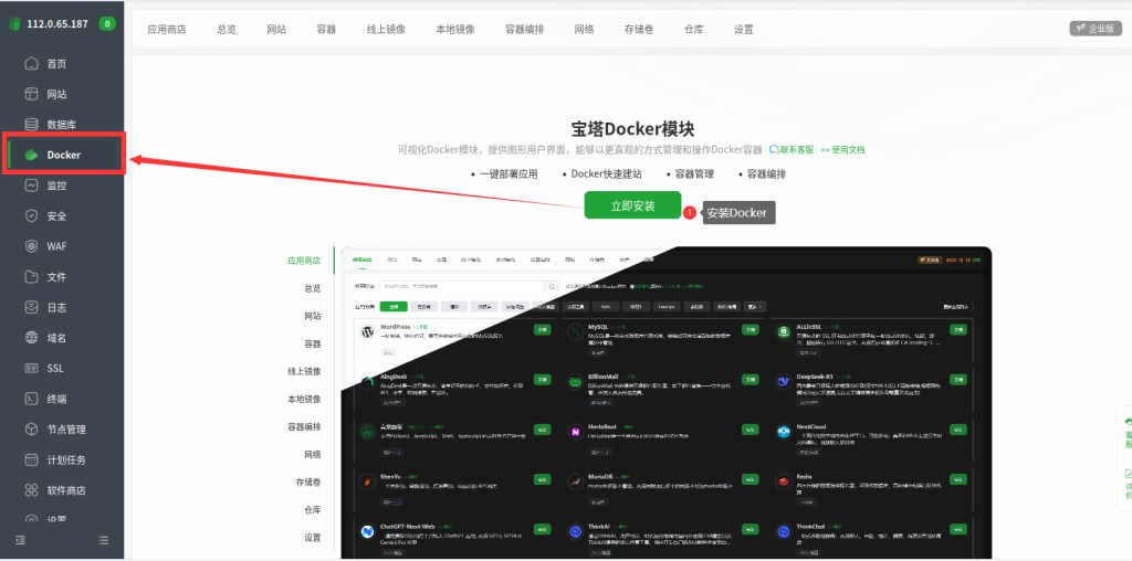 在宝塔面板右侧点击docker,立即安装