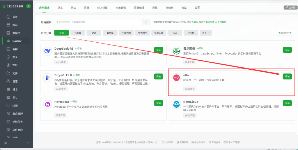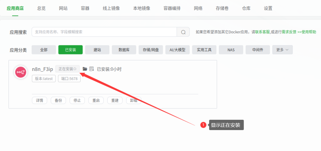 接下来我们返回docker,点击应用商店,找到n8n点击安装