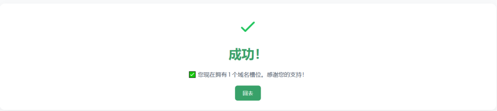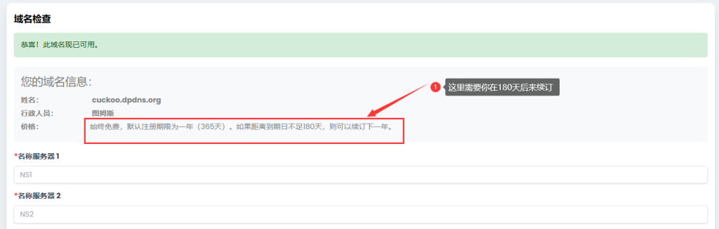 成功之后会有这样的提示这时候你的域名就成功获取了,注意这里180天之后需要来更新一次之后就可以永久免费使用此域名了,我们可以部署一个自动化提醒的项目【自动化续订提醒】