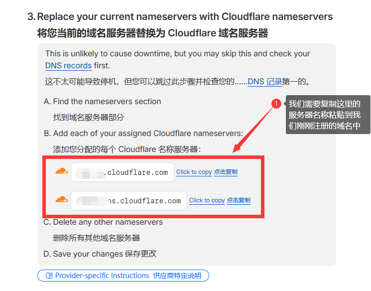 找到下面的名称服务器,我们需要把这两个服务器链接,复制到DigitalPlat 域名中,就是我们刚刚免费申请的域名中