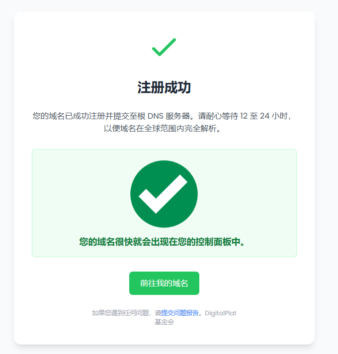然后回到DigitalPlat 域名控制面板,第4步点击此处验证,就会看到这样的提示,接下来就可以创建自己的域名了