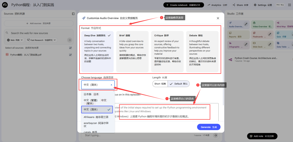 - 用途: 两个 AI 角色会像主持人一样讨论你文档中的核心观点,非常适合在通勤或休息时通过听觉快速吸收信息。