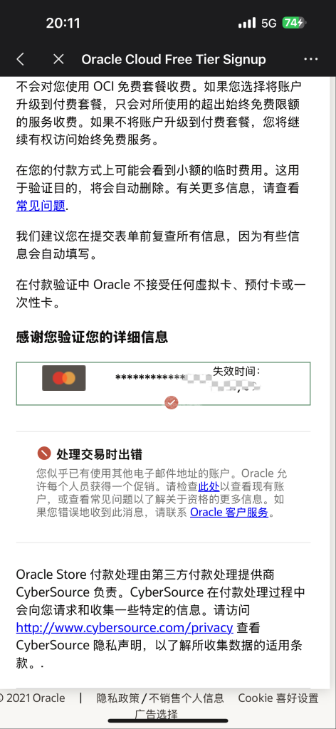 甲骨文服务器添加信用卡界面