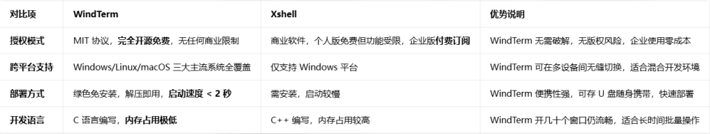 为什么选择WindTerm,相比Xshell,它的优势有很多,市面上也是越来越多的人在使用它,这里做一个简单的总结:WindTerm 凭借开源免费、跨平台、高性能、功能全面等优势,成为替代 Xshell、SecureCRT 等商业终端工具的理想选择。它不仅提供了专业终端工具的所有核心功能,还通过现代化设计和智能特性提升了工作效率,特别适合需要频繁进行远程操作的技术人员使用。
